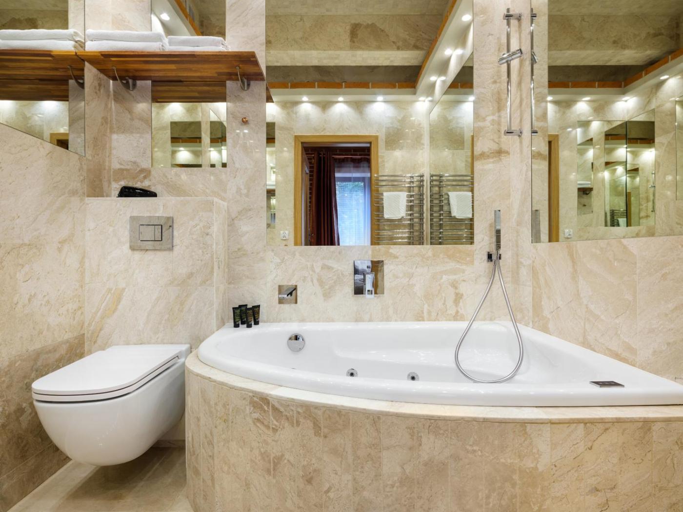 Pokój Dwuosobowy typu Deluxe z balkonem. To studio dwuosobowe typu deluxe zdobią odsłonięte cegły i podłoga wyłożona parkietem. W studiu znajduje się wanna z hydromasażem, w pełni wyposażony aneks kuchenny, 40-calowy telewizor LED oraz sejf na laptopa. Goście mają do dyspozycji balkon z widokiem na ogród. Pokój Dwuosobowy - 2 osobowy. Powierzchnia pokoju ok.: 23 mkw.